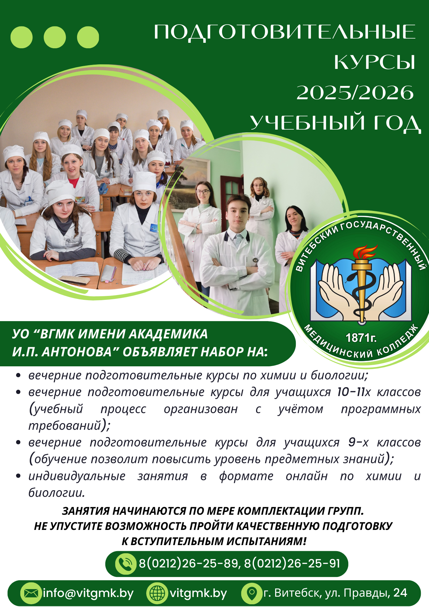 Уважаемые абитуриенты Напоминаем, что 22 марта в Витебском медицинском колледже пройдет Единый день открытых дверей с участием представителей организаций-заказчиков кадров. В ходе мероприятия вы познакомитесь с колледжем, правилами приема в ВГМК в 2025 году, конкурсами и проходными баллами в учреждение образования в 2024 году. ️Ответственный секретарь приемной комиссии проинформирует о специальностях, возможностях обучения на условиях целевой подготовки, перспективах будущего трудоустройства. Ждем вас 22 марта в 10.00 по адресу: г. Витебск, ул. Правды, 24 (актовый зал, 3-ий этаж). Справки по тел. 80(212)-22-38-16, 80(212)-26-25-93