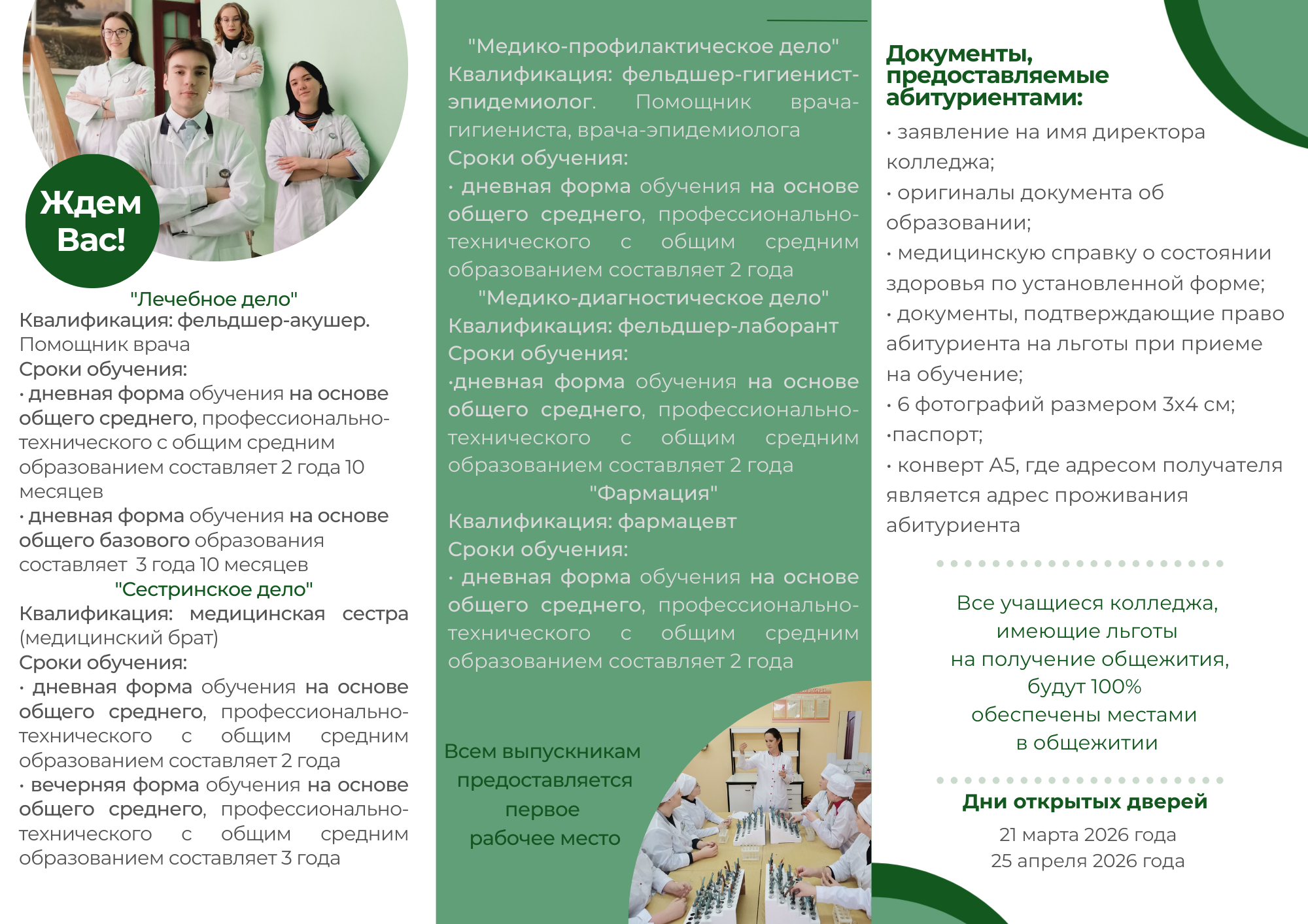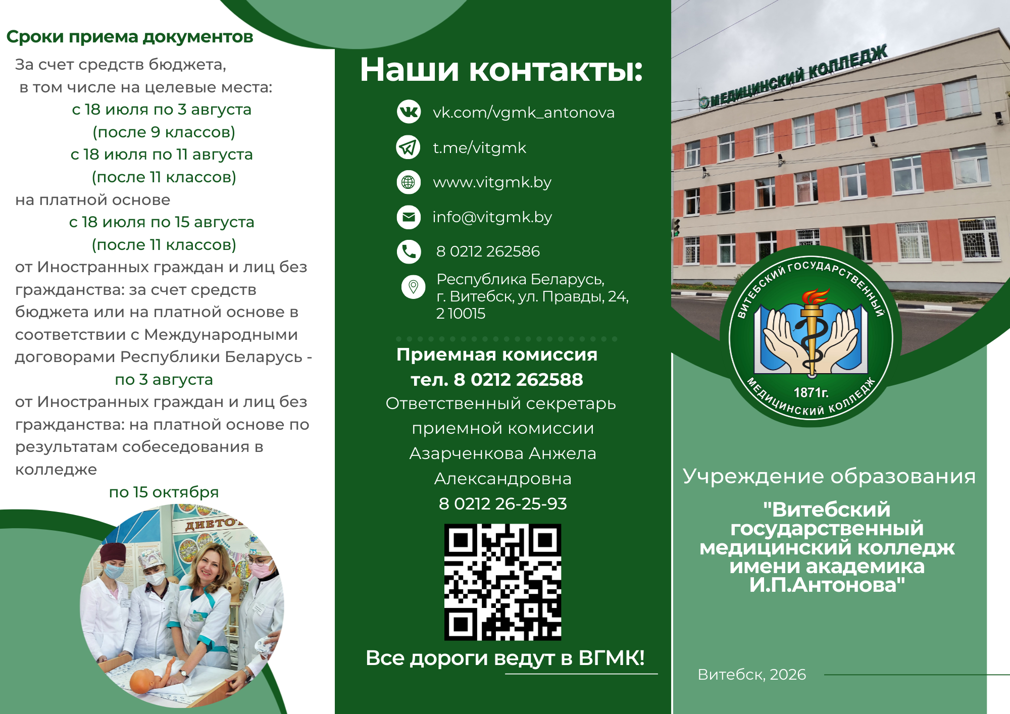21 марта в Витебском медицинском колледже прошел Единый день открытых дверей, который собрал школьников Минской, Могилёвской, Витебской области и г. Витебска. В профориентационном мероприятии приняли участие представители организаций-заказчиков кадров: старшая медицинская сестра, председатель сектора по профобразованию Совета сестер УЗ"ВОКБ" Саулевич Ю.И., главная медицинская сестра ГУЗ "Витебский областной клинический центр медицинской реабилитации для инвалидов и ветеранов боевых действий на территории других государств" Наровская А.В., медсестра взрослого диагностического отделения УЗ "ВОКИБ", выпускница колледжа Воронцова Н.А. Представители практического здравоохранения рассказали о своих организациях, условиях работы, гарантиях молодым специалистам и возможностях получения целевого направления. ️Ответственный секретарь приемной комиссии Азарченкова А.А. проинформировала об особенностях вступительной кампании 2026 года, результатах приема 2025 года, особое внимание обратила на преимущества целевой подготовки и ответила на вопросы абитуриентов. Участники агитбригады "ПрофМедикСлужба" ярко и эмоционально представили специальности, рассказали о насыщенной, интересной жизни учащегося ВГМК. После завершения мероприятия будущие абитуриенты и их родители посетили музей истории колледжа.