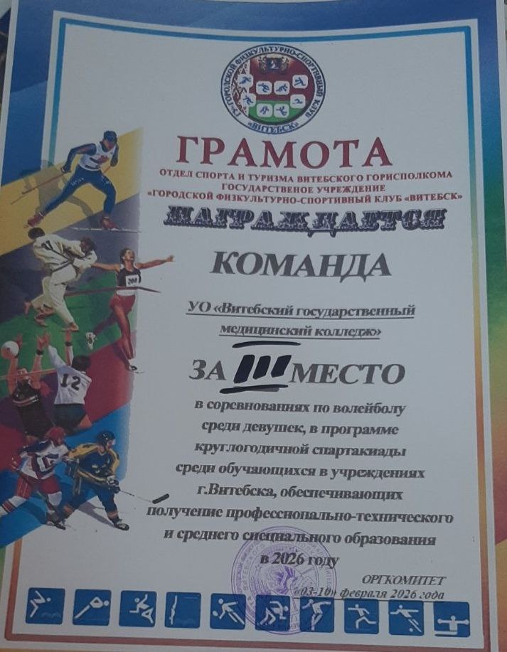 Поздравляем команду девушек Витебского медицинского колледжа, занявшую III место в соревнованиях по волейболу среди учащихся ПТО и ССО в рамках круглогодичной спартакиады г. Витебска.
