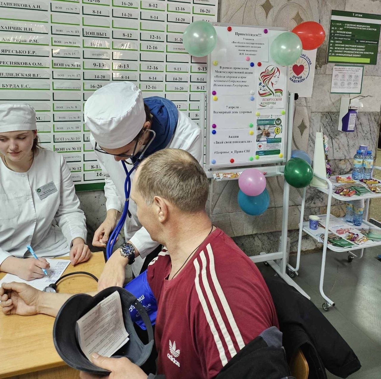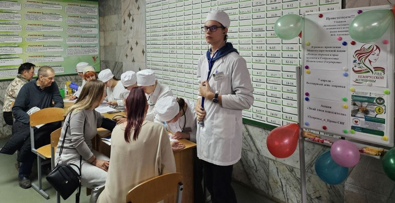 Здоровье начинается с тебя! 7 апреля в рамках Всемирного дня здоровья учащиеся группы 201.9 «Лечебное дело» Витебского медицинского колледжа вместе с преподавателем Руденковой Светланой Сергеевной, сотрудниками поликлиники №2 г.Витебска организовали и провели акцию «Знай свои показатели». Учащиеся измерили все самые важные показатели у посетителей поликлиники: Рост, Вес, Артериальное давление, Пульс Уровень, кислорода в крови (O2), Индекс массы тела (ИМТ), Экспресс-анализ на уровень глюкозы. А чтобы порадовать пациентов, подготовили вкусные бонусы и полезные памятки о здоровом образе жизни. Быть здоровым — это знать свои цифры и беречь себя! #Здоровье_и_Права_СНГ #ВсемирныйДеньЗдоровья #ЗнайСвоиПоказатели #ВолонтерВГМК #ВитебскийГМК
