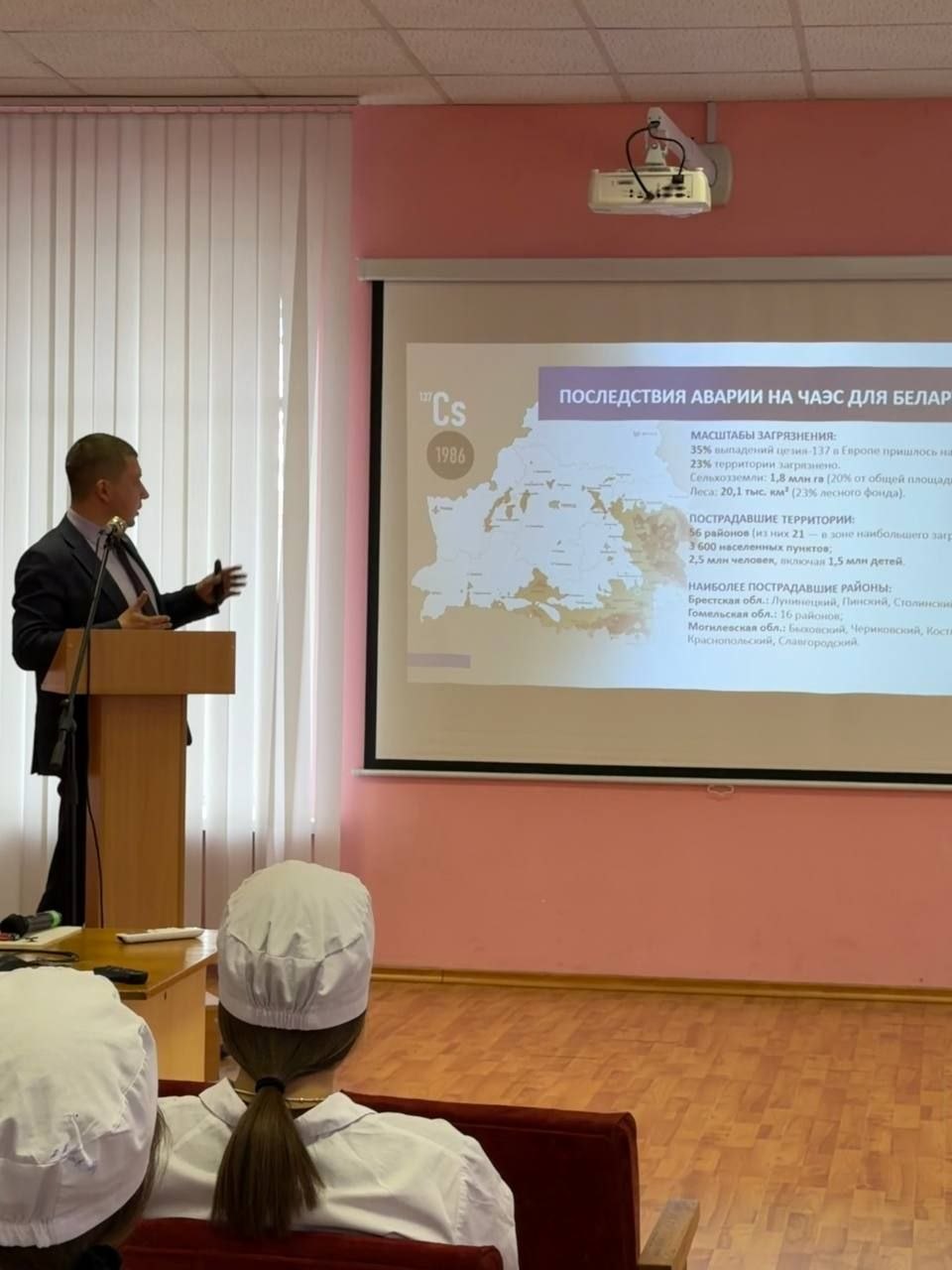 В Витебском медицинском колледже состоялся Единый день информирования, посвященный 40-летию аварии на Чернобыльской АЭС. Спикером мероприятия выступил заместитель главы администрации Октябрьского района г.Витебска Гордеев А.Н. В ходе выступления были освещены ключевые этапы преодоления последствий катастрофы, акцент сделан на мерах социальной защиты людей, пострадавших от аварии на ЧАЭС. Докладчик остановился на современных аспектах оказания медицинской помощи и отметил, что система здравоохранения в нашей стране постоянно совершенствуется, повышается доступность и качество оказания медицинской помощи. Разговор с заместителем главы администрации вышел за рамки сегодняшней темы. Алексей Николаевич рассказал о перспективах развития Витебска, а также ответил на вопросы присутствующих, которые касались благоустройства, строительства и ЖКХ района и города.