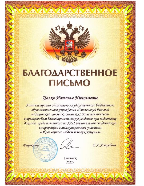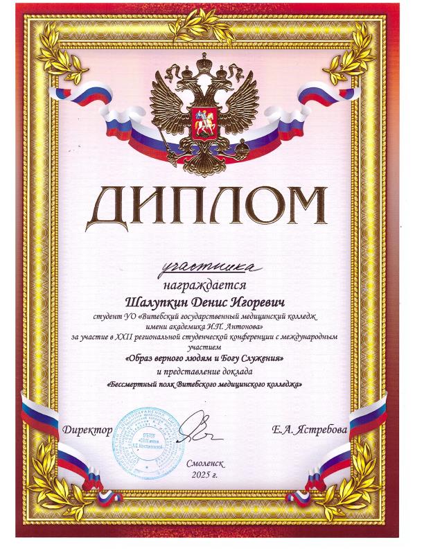 "Духовное наследие и сохранение исторической памяти Великой Отечественной войны в современном мире"-тема XXII Региональной с международным участием студенческой научно-практической конференции, которая состоялась 29 октября 2025 в г. Смоленске. С докладом "Бессмертный полк Витебского медицинского колледжа" выступил учащийся группы 201.9 "Лечебное дело" Денис Шалупкин. Выступление учащегося было отмечено дипломом и благодарностью заместителю директора по учебно-методической работе Н.Н Цалко.