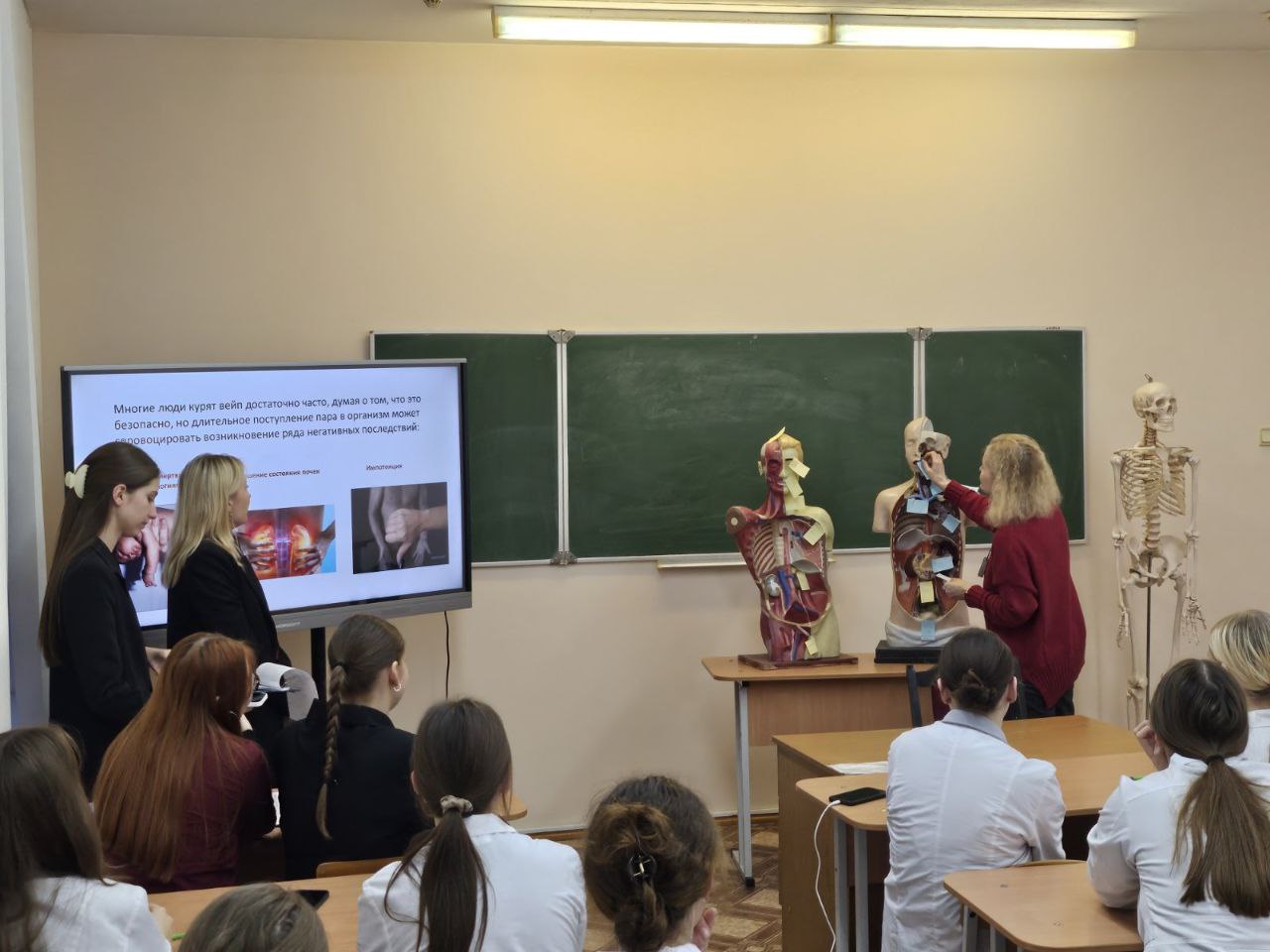 21 ноября в 202 группе отделения «Фармация» состоялся открытый час куратора "Вся правда о вреде курения электронных сигарет". Учащиеся активно приняли участие в дискуссии о вреде курения вейпов, развеяли мифы о "безвредности" электронных сигарет и ответили на вопросы викторины. В завершении часа куратора прошла интересная рефлексия: капитаны команд наклеили стикеры на манекен, обозначающие негативное влияние курения на конкретные органы. Такой наглядный метод позволил понять разрушительное действие токсинов и канцерогенов на легкие, сердце, мозг, пищеварительную и репродуктивную системы. Интерактивный подход повысил осознанность учащихся, помог сформировать профессиональную позицию фармацевтов как пропагандистов здорового образа жизни и развил критическое мышление по профилактике никотиновой зависимости.