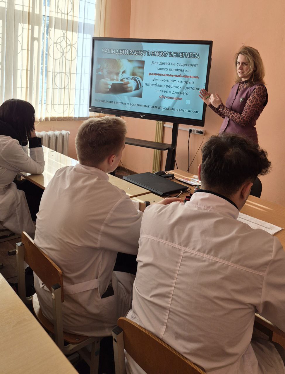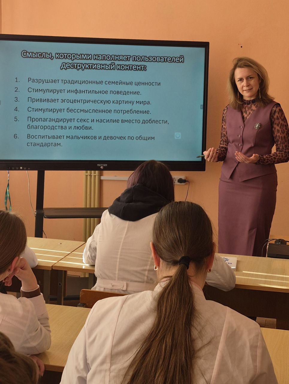 20 февраля с учащимися 1 курса отделения "Лечебное дело" Витебского медицинского колледжа в рамках месячника правовых знаний состоялся открытый диалог с психологом Благотворительного фонда поддержки семьи, материнства и детства «Покров» В.Е.Прудниковой. На встрече обсудили нравственные ориентиры современной молодёжи, негативное влияние деструктивных интернет-сообществ на формирование личности молодых людей и меры защиты от этих негативных проявлений. Участники мероприятия получили красочные тематические листовки.