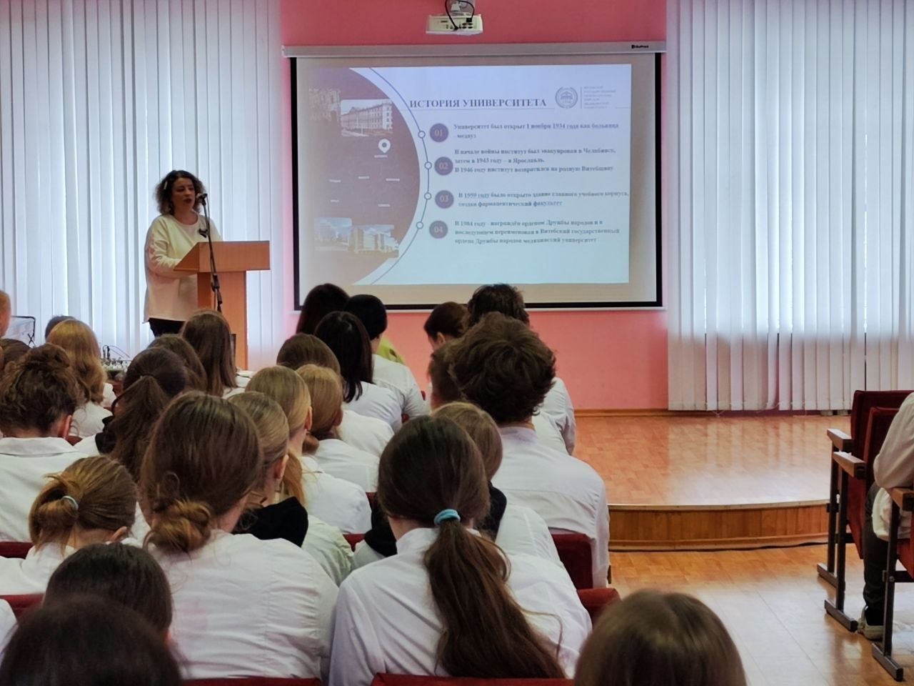 8 апреля в Витебском медицинском колледже была организована и проведена встреча учащихся выпускных групп с заместителем декана факультета довузовской подготовки ВГМУ Ореховой Л.И. и доцентом кафедры социальной педагогики и психологии ВГУ Крестьяниновой Т.Ю. по вопросам привлечения абитуриентов к поступлению в университеты, в том числе на условиях целевой подготовки. Гости рассказали о преимуществах целевого поступления, возможностях профессионального роста и трудоустройства. Данная встреча оставила положительные эмоции у всех участников мероприятия.