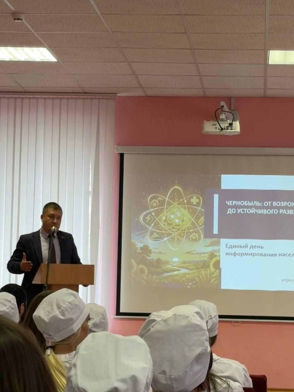 В Витебском медицинском колледже состоялся Единый день информирования, посвященный 40-летию аварии на Чернобыльской АЭС. Спикером мероприятия выступил заместитель главы администрации Октябрьского района г.Витебска Гордеев А.Н. В ходе выступления были освещены ключевые этапы преодоления последствий катастрофы, акцент сделан на мерах социальной защиты людей, пострадавших от аварии на ЧАЭС. Докладчик остановился на современных аспектах оказания медицинской помощи и отметил, что система здравоохранения в нашей стране постоянно совершенствуется, повышается доступность и качество оказания медицинской помощи. Разговор с заместителем главы администрации вышел за рамки сегодняшней темы. Алексей Николаевич рассказал о перспективах развития Витебска, а также ответил на вопросы присутствующих, которые касались благоустройства, строительства и ЖКХ района и города.